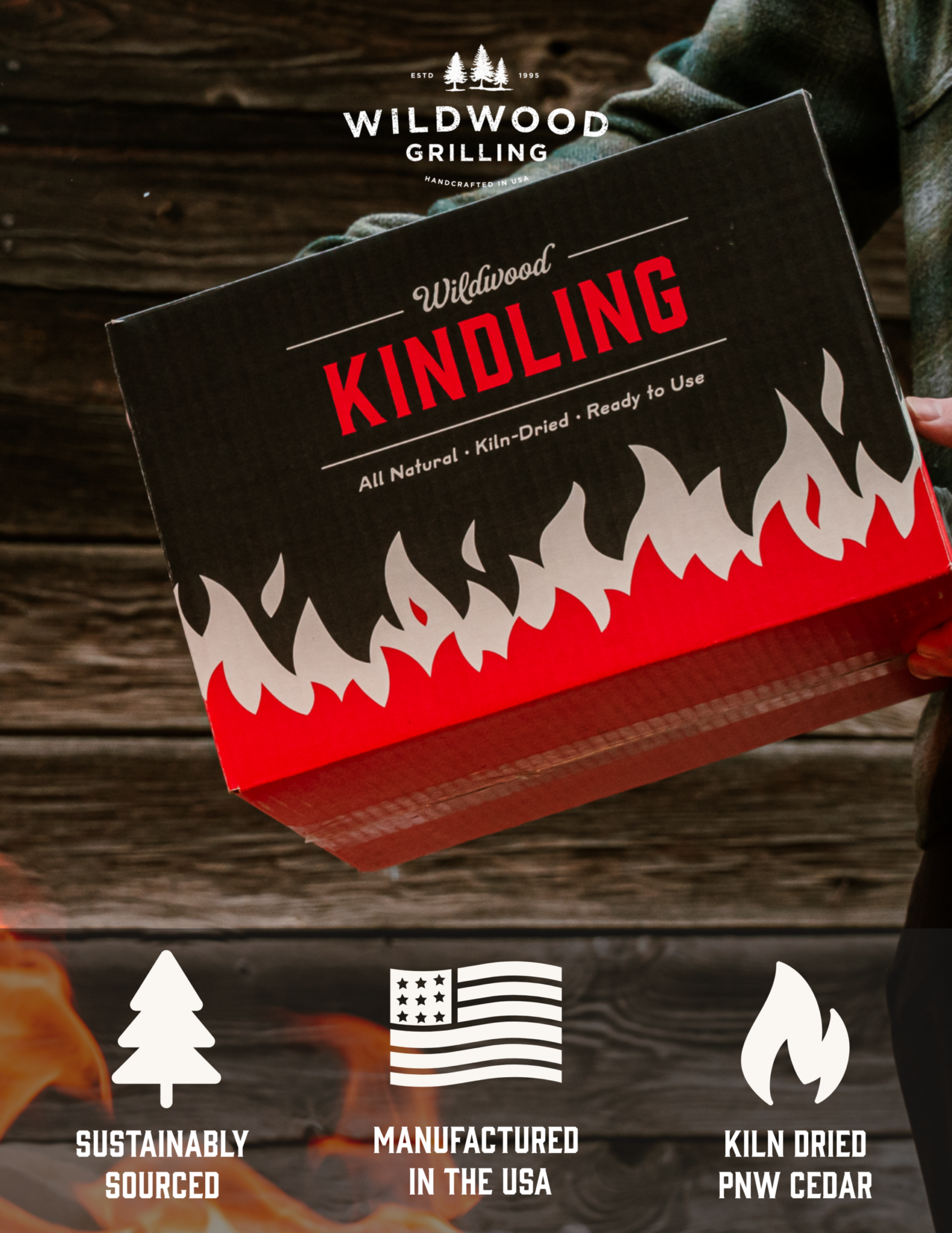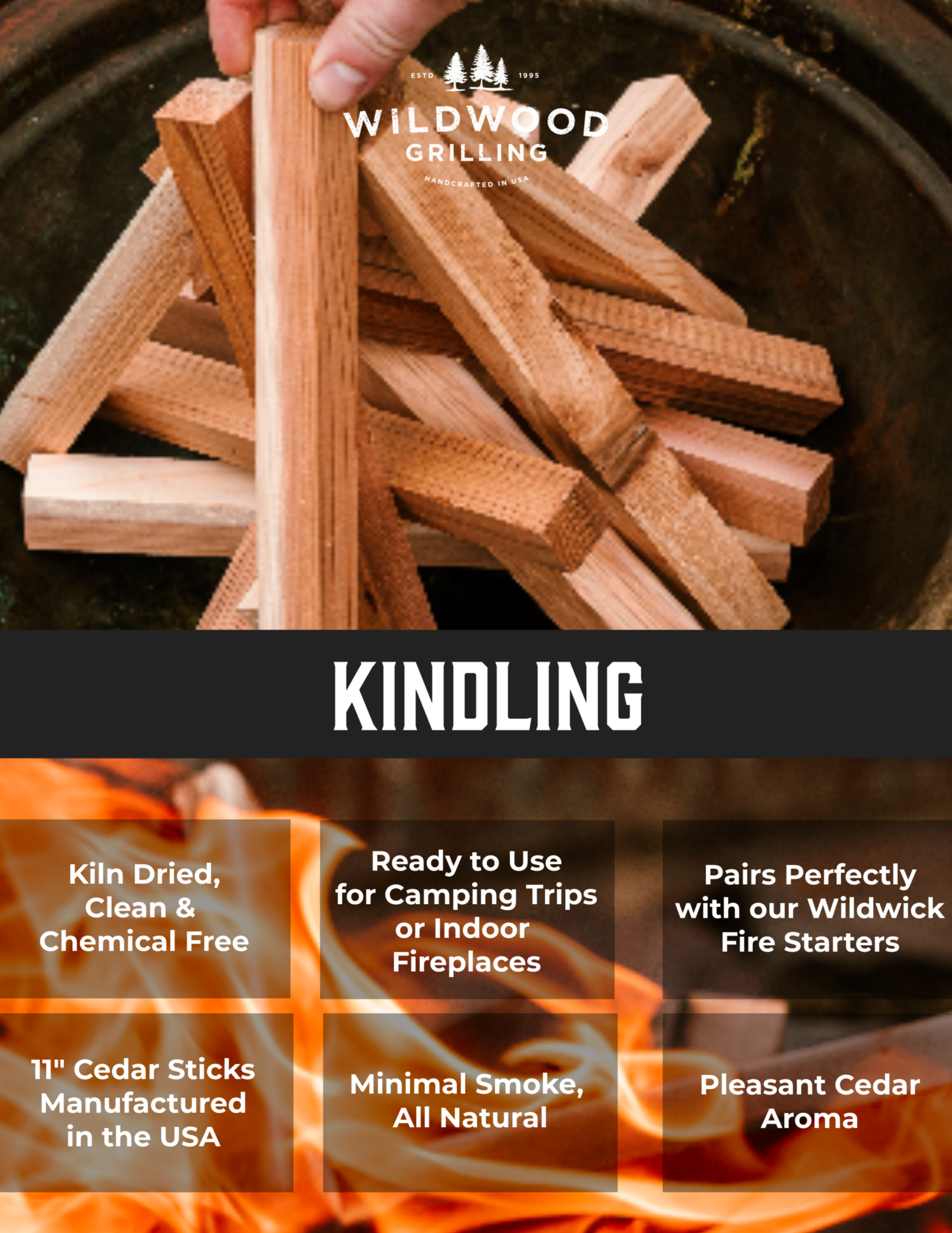 Every fire needs a blend of fuel sources, and Wildwood Kindling is crafted to be the crucial stepping stone to build quick, robust, reliable flames.