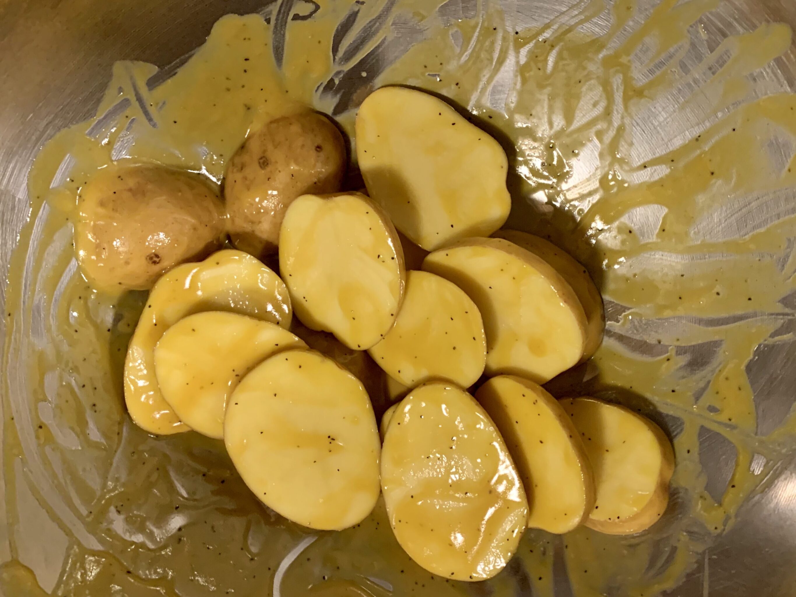 - Combine remaining ingredients and mix well. Toss potatoes in mustard sauce until evenly coated.
